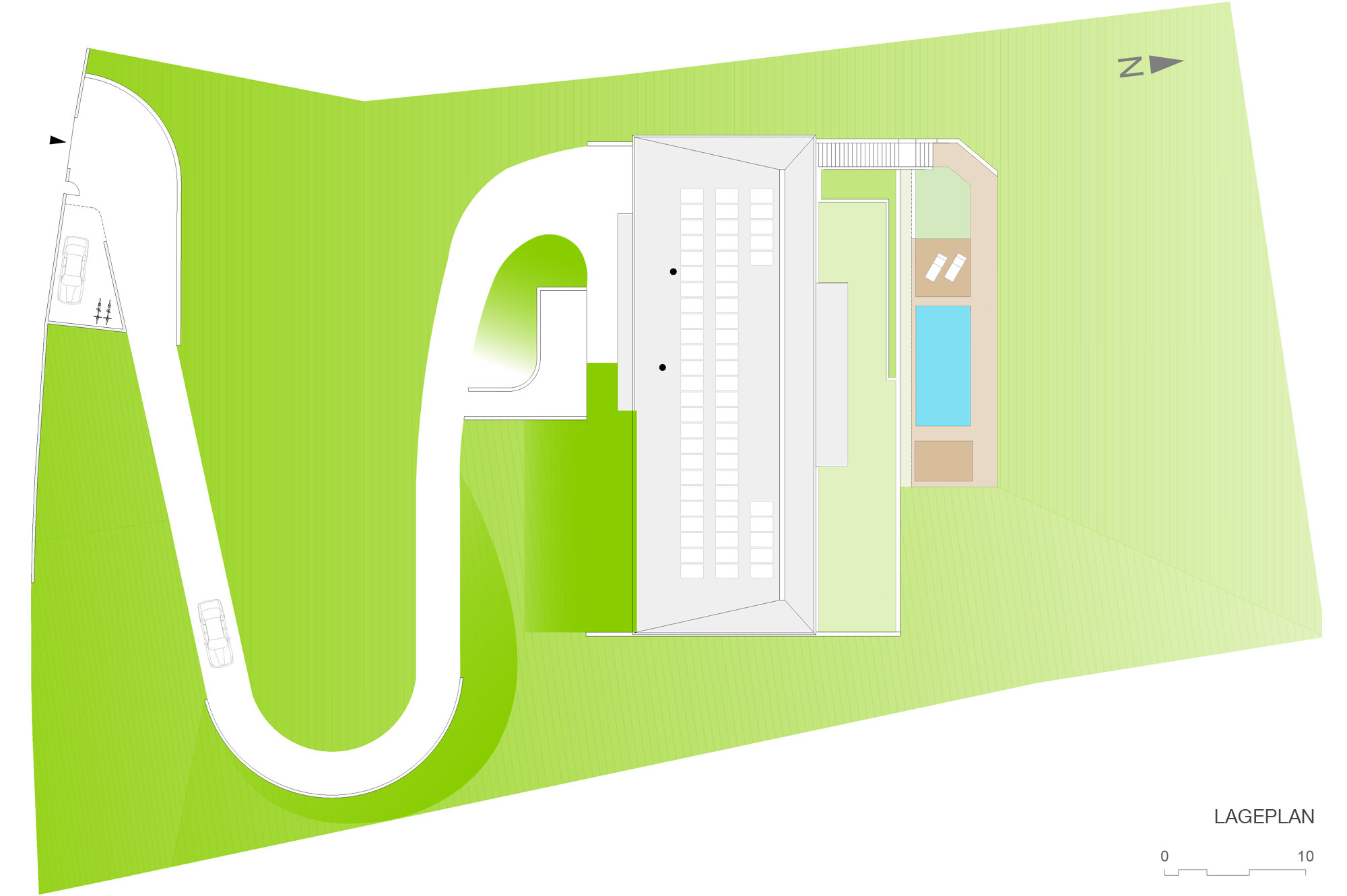 In der in Massivbauweise ausgeführte Sockelzone mit vorgehängtem Sichtziegelmauerwerk befinden sich das Entree, der Gäste- und Arbeitsbereich sowie der Wellnessbereich, wodurch die gewünschte Intimität und Rückzugsmöglichkeit für diese Wohnbereiche geschaffen wird. Weiters sind in dieser Ebene die Stellplätze – mit einem extensiv begrünten Dach – untergebracht. Zum Garten hin öffnet sich diese Ebene großzügig, wodurch eine direkte Verbindung zum südseitig gelegenen Grünraum mit integriertem Pool gegeben ist.