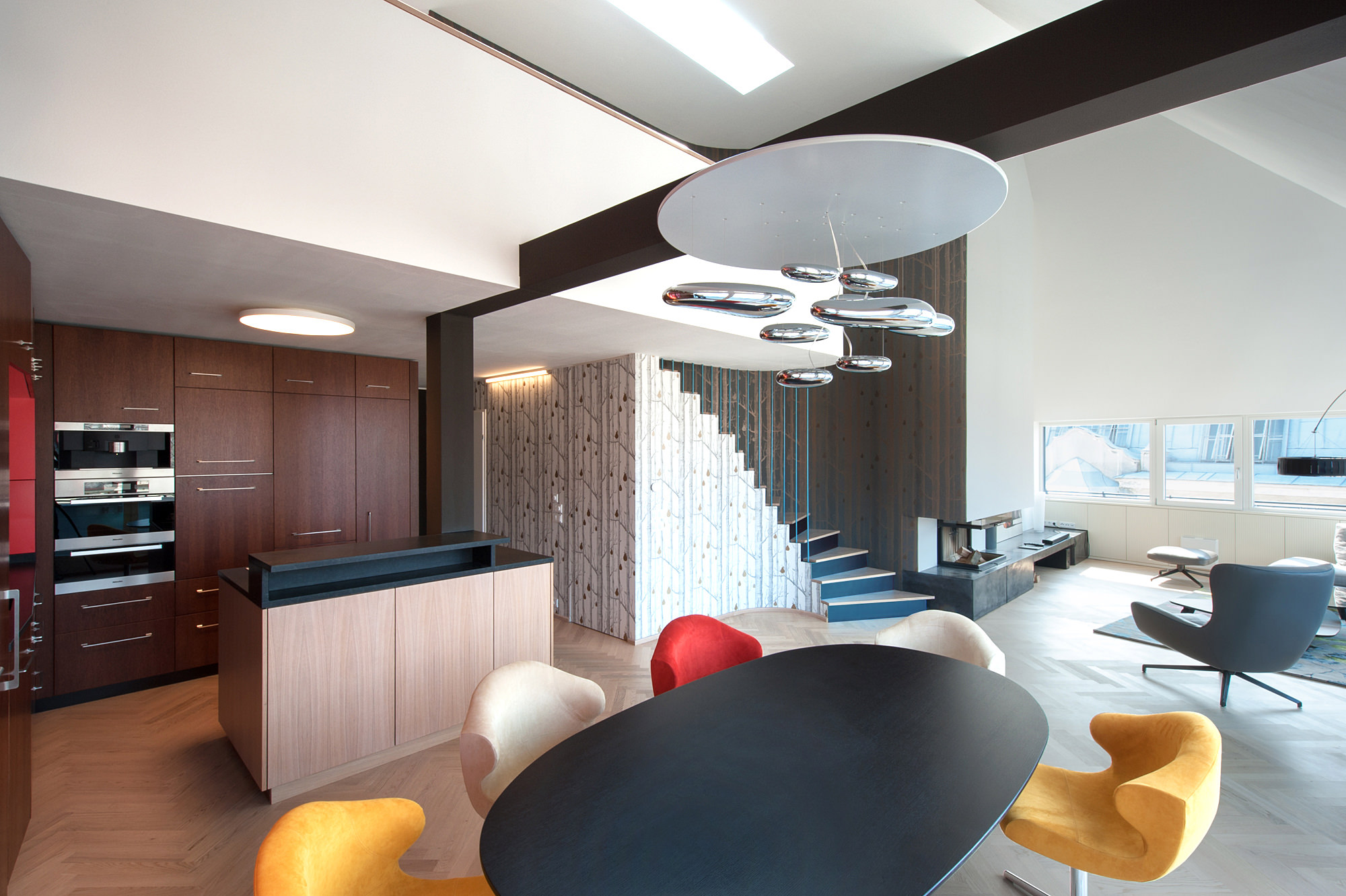 Der offene Kochbereich orientiert sich hin zum großzügigen, repräsentativen Esstisch, ist aber in seiner Erscheinung zurückhaltend und integriert sich optisch in die zweigeschossige Holzvertäfelung. Diese raumbestimmende Holzvertäfelung verbindet das Galeriegeschoss mit dem Hauptgeschoß. Die Zentrale gewendelte Treppe schafft einen fließenden Übergang zwischen dem Schlaf-, und Wohnbereich. Die vertikale Struktur der Baumtapeten unterstützt noch zusätzlich die optische Verklammerung der Galerie und des Hauptgeschosses. Der Hauptraum mit seinem großzügigen Essbereich, der vorgelagerten Terrasse und dem anschließenden Wohnbereich wird von einem offenen Kamin mit Sichtbetonsockel flankiert.