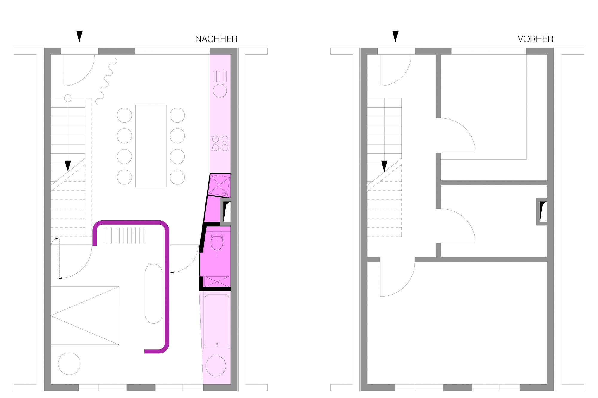Diese Elemente umschließen und begleiten den Essbereich und den Empfang. Die abgerundeten Ecken der Klammer, ihre Helligkeit und Situierung erzeugen einen luftigen, großzügigen Eindruck – der Raum umfließt die Klammer. Durch diesen Eingriff wird die gesamte Raumtiefe wahrnehmbar, wodurch – je nach Tageszeit – spannende Lichtstimmungen entstehen.